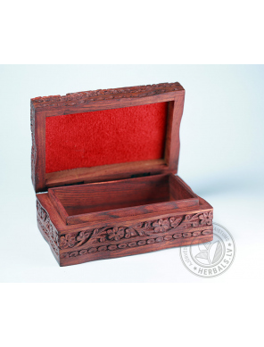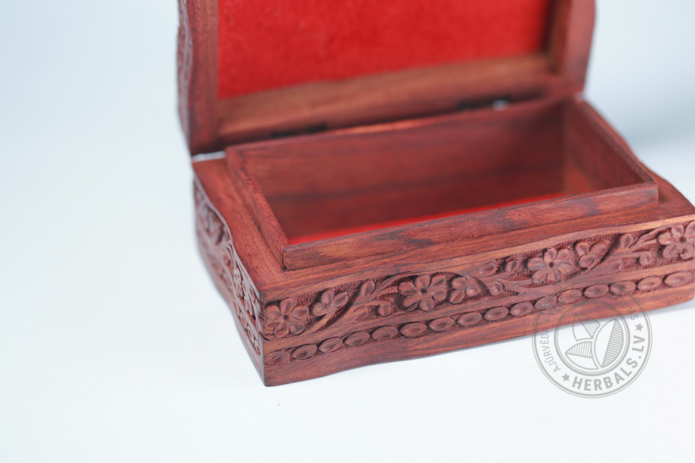 Šī unikālā kastīte izceļas ar rūpīgu roku darbu un dizainu. Koka grebums rada izsmalcinātus rakstus.