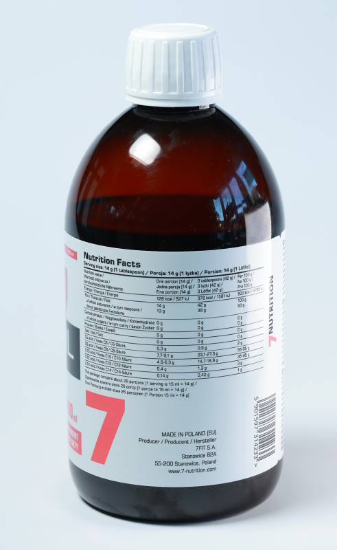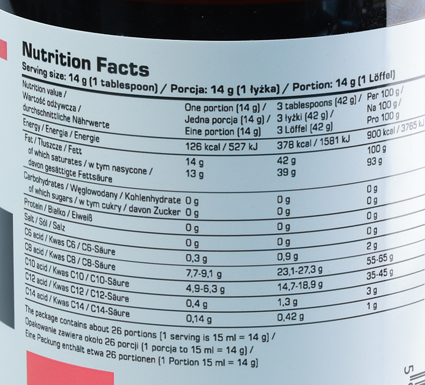 Vidējas ķēdes taukskābes. Tā ir tauku forma, kuru organisms ļoti ātri un efektīvi “sadedzina”, lai iegūtu enerģiju. Lietojot ikdienas uzturā, tā palīdz palielināt izturību, spēku un muskuļu masu. Šī eļļa satur tikai vidējas ķēdes taukskābes, kas satur 2 reizes vairāk enerģijas nekā ogļhidrāti un olbaltumvielas.
