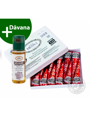 Slavenais Indijas ražotājs ir izstrādājis sastāvu hipoalerģiskai mehendi eļļai. Tās izmantošana ļauj zīmējumam būt spilgtam un palikt daudz ilgāk. Mehendi eļļas dabīgas sastāvdaļas vispusīgi sagatavo Jūsu ādu: mīkstina nedaudz paplašinātas poras, tai piemīt dezinficējoša iedarbība un smalks aromāts padarīs zīmēšanas procesu ar hennu uz ādas vairāk patīkamu.