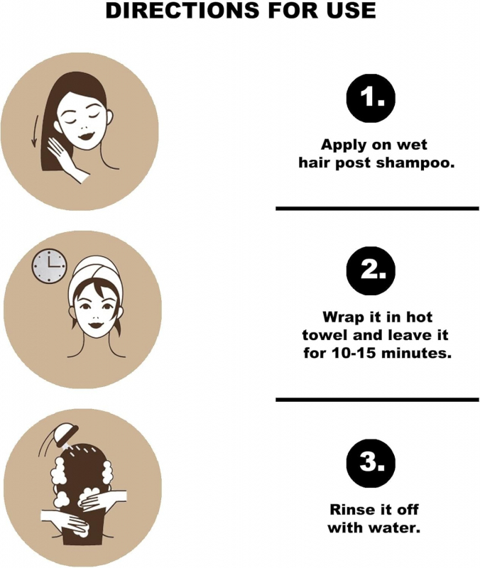 Начин на употреба: Препоръчва се след измиване на косата да нанесете маската върху мокра коса, да увиете с топла кърпа и да оставите да действа 15 минути, след което изплакнете с топла вода.