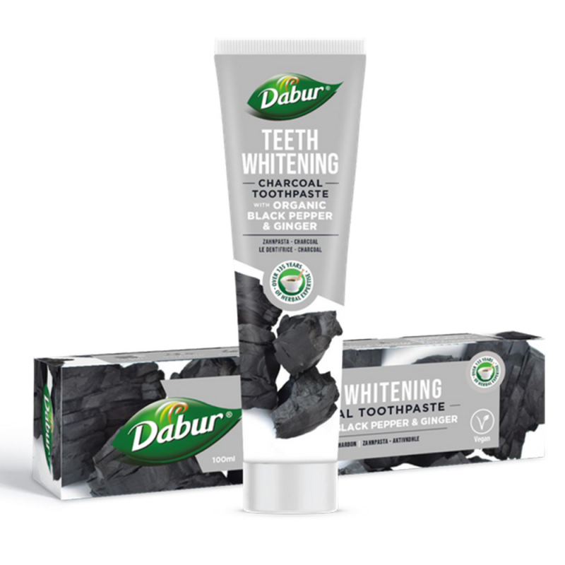 Пастата за зъби Dabur Charcoal с органичен черен пипер и джинджифил представлява уникална комбинация от едни от най-ефективните съставки на природата, като въглен, джинджифил и черен пипер. Активният въглен има дълга и доказана история като мощна и ефективна съставка за грижа за устната кухина. Пастата притежава силни избелващи свойства благодарение на активния въглен, като премахва петната и ви оставя с ослепително бяла усмивка.
