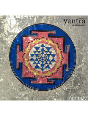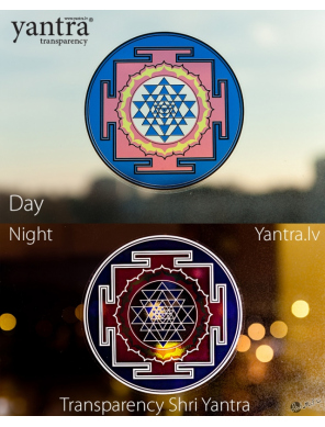Сaurspīdīga uzlīme Šri Jantra, ko var uzlīmēt uz stikla vai jebkuras citas gludas virsmas: logs, automašīnas stikls, stikla durvis, spoguļi, logi, ledusskapis.