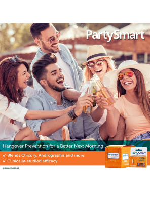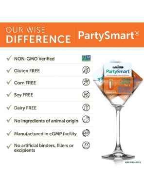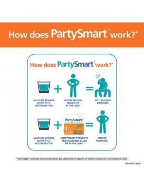 Relieves after-effects of alcohol: When alcohol is consumed, it is mainly converted into acetaldehyde (an intermediate metabolite of alcohol metabolism) by the liver. Acetaldehyde at higher concentrations leads to unpleasant after-effects such as fatigue, headache, nausea, vomiting, body ache, burning sensation in the stomach and drowsiness. PartySmart prevents these symptoms by rapidly eliminating acetaldehyde from blood. The drug eliminates acetaldehyde by increasing ADH (alcohol dehydrogenase) and ALDH (aldehyde dehydrogenase) activity, without any side effects.