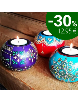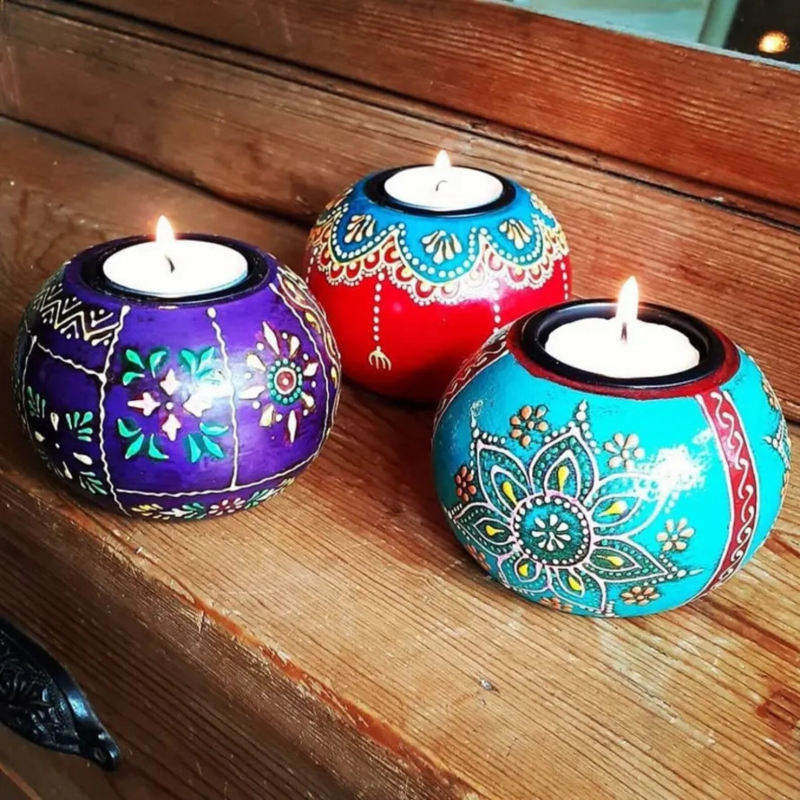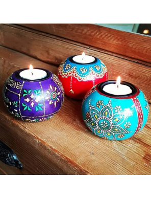Gorgeous turquoise, hand painted, round tealight holder, handcrafted from mango wood, a sustainable fast growing wood. Hand painted in beautiful rich colours.