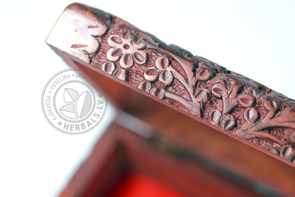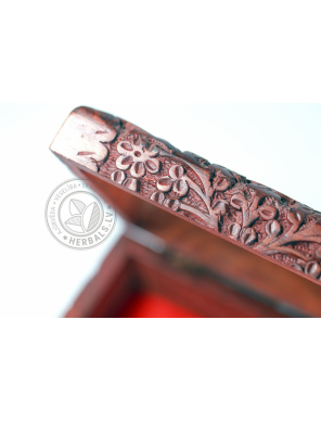 This unique box stands out for its meticulous handcrafting and design. Wood carving creates sophisticated patterns. The inside of the box is soft velvet, burgundy color.