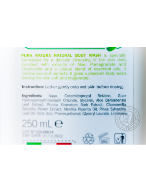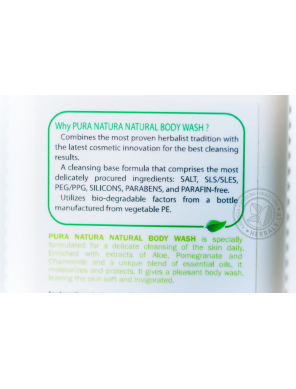 PURA NATURA NATURAL BODY WASH is specially formulated for a delicate cleansing of the skin daily. Enriched with extracts Aloe, Pomegranate and Chamimile and unique blend of essential oils.