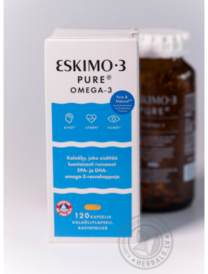 Чистый натуральный продукт из Швеции, сертифицированный "Friend of the Sea". Высококачественный концентрированный и специально очищенный рыбий жир из Швеции. Получен из мелкой рыбы (анчоусы, сардины), дополнен инновационной антиоксидантной смесью PUFANOX, которая длительное время сохраняет те же свойства рыбьего жира. «ЭСКИО-3 Чистый» предназначен для взрослых и детей старше 12 лет. Особенно подходит для беременных женщин, кормящих матерей и людей, которые не переносят аромат и вкус рыбьего жира. Рыбий жир, содержащийся в капсуле «ЭСКИМО-3 Pure», настолько очищен, что не имеет ни вкуса, ни запаха.