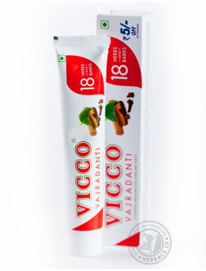 Состав зубной пасты ВИККО (100г): Акация аравийская (Acacia arabica) - 1.8 г, Джамун (Syzygium cumini) - 1 г, Гвоздика (Syzygium aromaticum) - 0.06 г, Манджиштха (Rubia cordifolia) - 2.6 г, Коричник цейлонский (Cinnamomum zeylanicum) - 0.16 г, Зизифус настоящий (Ziziphus jujuba) - 1 г, Барлерия капкановидная (Barleria prionitis) - 0.5 г, Грецкий орех (Juglans regia) - 0.06 г, Акация катеху (Acacia catechu) - 1.64 г, Патанга (Caesalpinia sappan) - 2.4 г, Мимусопс Эленг (Mimusops elengi) - 3.2 г, Яштимадху (Glycyrrhiza glabra) - 1.3 г, Индийская колючая (Zanthoxylum rhetsa) - 1.94 г, Сассапариль (Hemidesmus indicus) - 0.4 г, Кора дуба (Querous Infectoria) - 0.06 г, Трифала (Trifala) - 1.6 г, Ажгон (Carcum copticum) - 0.02 г, Слюногон лекарственный (Anacyclus pyrethrum) - 0.26 г, Наполнители - Q.S. (необходимое количество).