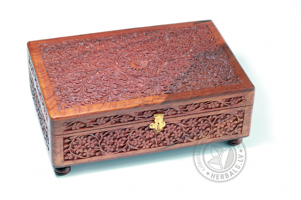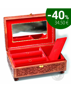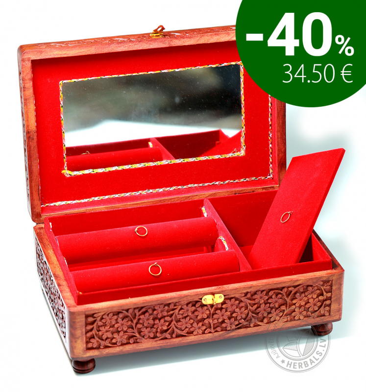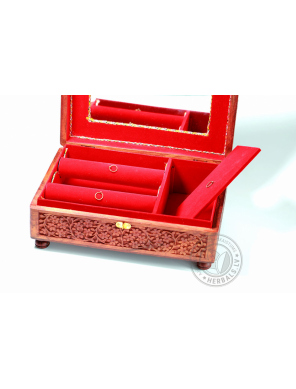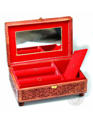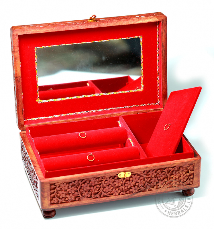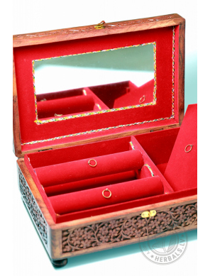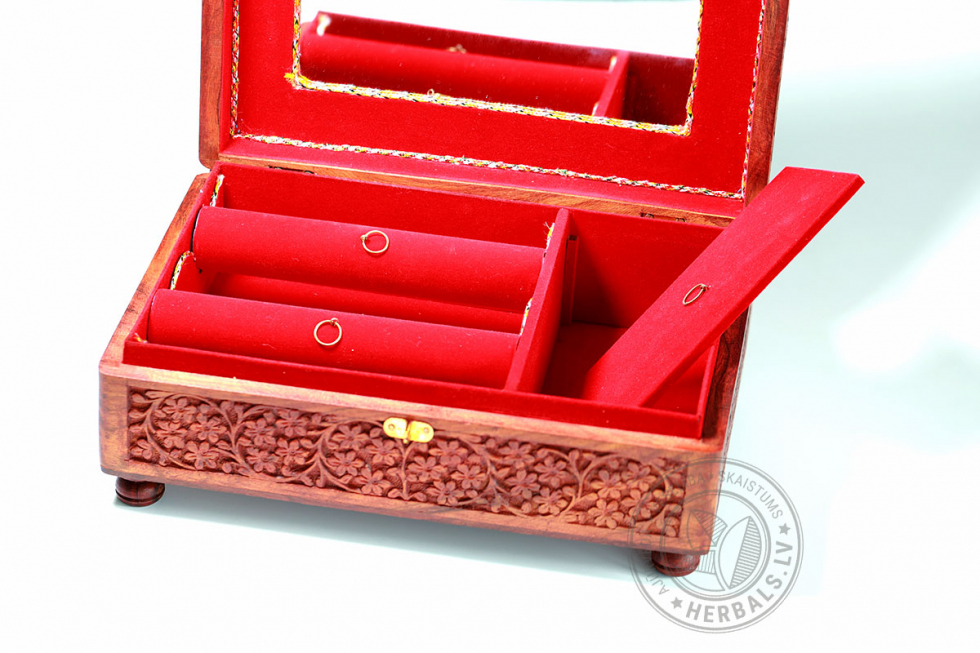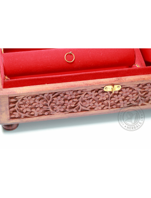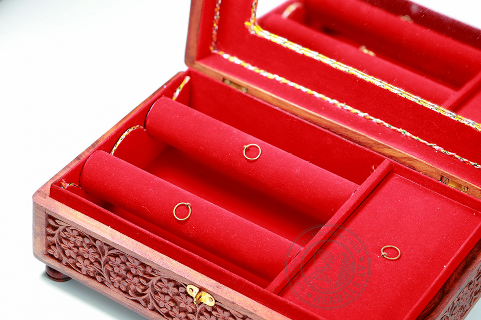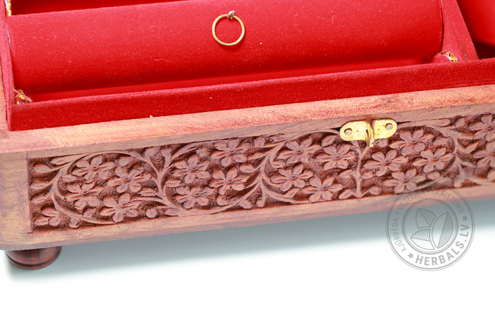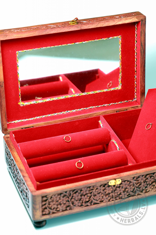 The jewelry box is made from high-quality Sheesham wood (Indian rosewood), known for its outstanding durability and natural beauty. Sheesham is prized for its rich texture and warm tones. The natural wood shades give the box a unique character, making it an elegant addition to any interior.