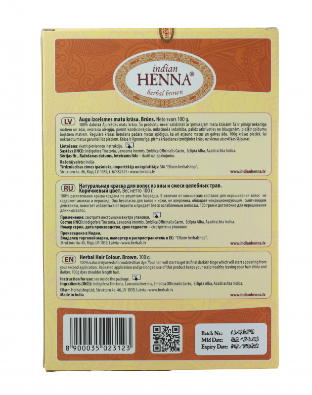 100% растительная краска создана по рецептам Аюрведы. В отличии от химических составов для окрашивания волос не содержит аммиак и пероксид. Она безопасна для волос и кожи, не алергенна, обладает кондиционирующим, смягчающим действием, помогает избавиться от перхоти и придает блеск ослабленным волосам. 100 грамм достаточно для окрашивания длинных волос.