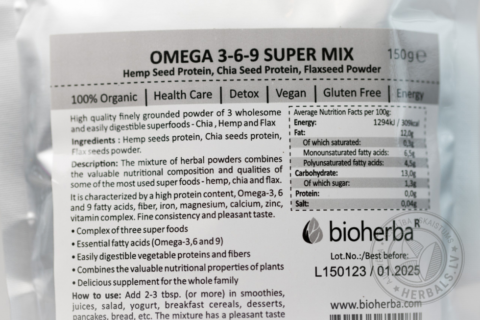 Смесь порошков семян сочетает в себе ценный питательный состав и свойства трех из наиболее часто используемых суперпродуктов — конопли, чиа и льна. Характеризуется высоким содержанием белка, омега-3, 6 и 9 жирных кислот, клетчатки, железа, магния, кальция, цинка, витаминного комплекса. Прекрасная текстура и приятный вкус.